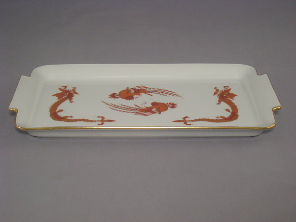 Meissen Kuchenplatte (Königskuchenplatte)reicher Drache, rot, goldgeschuppt, Goldrand, (Dekor 320510)Form Nr. 18508Länge 29 cm, Breite 14,5 cm, Höhe 2 cm